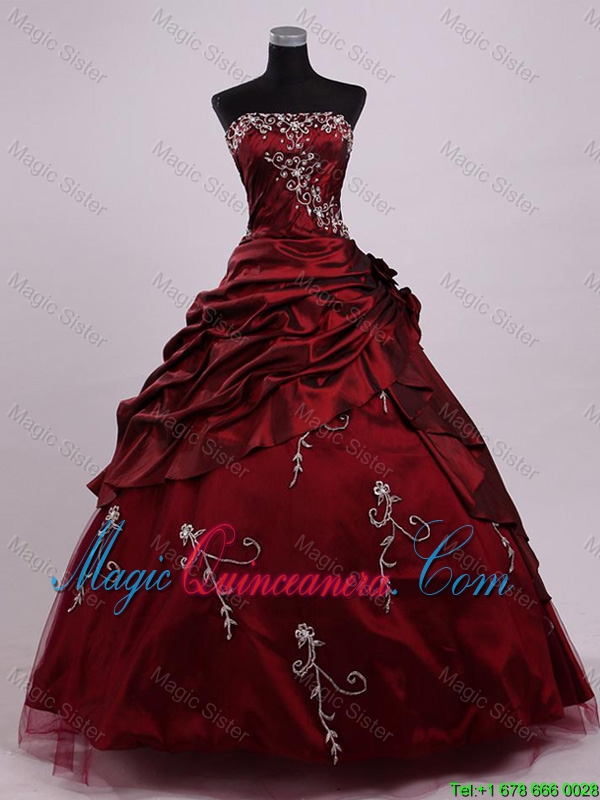 Elegant Strapless Ball Gown Wine Red Sweet 16 Dresses with Appliques