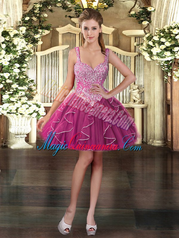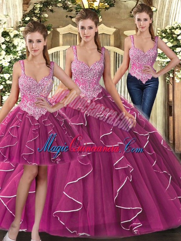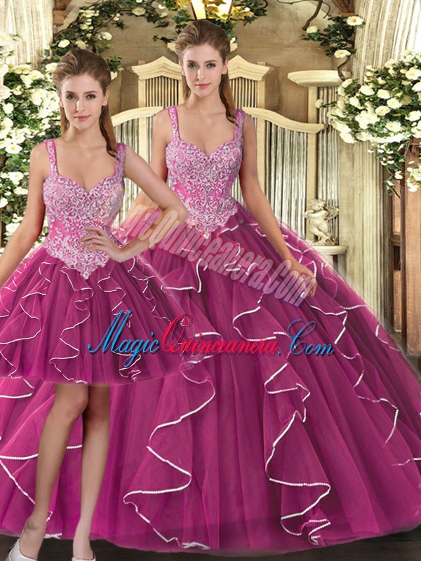 Elegant Straps Sleeveless 15th Birthday Dress Floor Length Beading and Ruffles Fuchsia Tulle - Magic Quinceanera