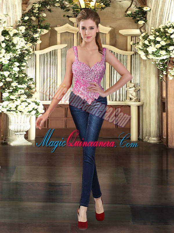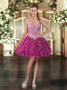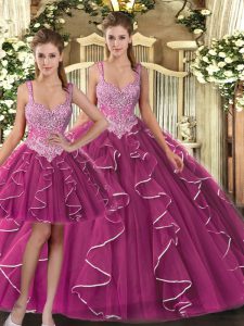 Elegant Straps Sleeveless 15th Birthday Dress Floor Length Beading and Ruffles Fuchsia Tulle
