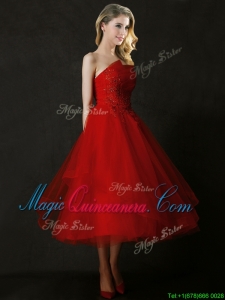 , Elegant Tea Length Applique Red Dama Dress with Asymmetrical Neckline