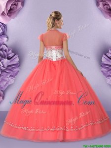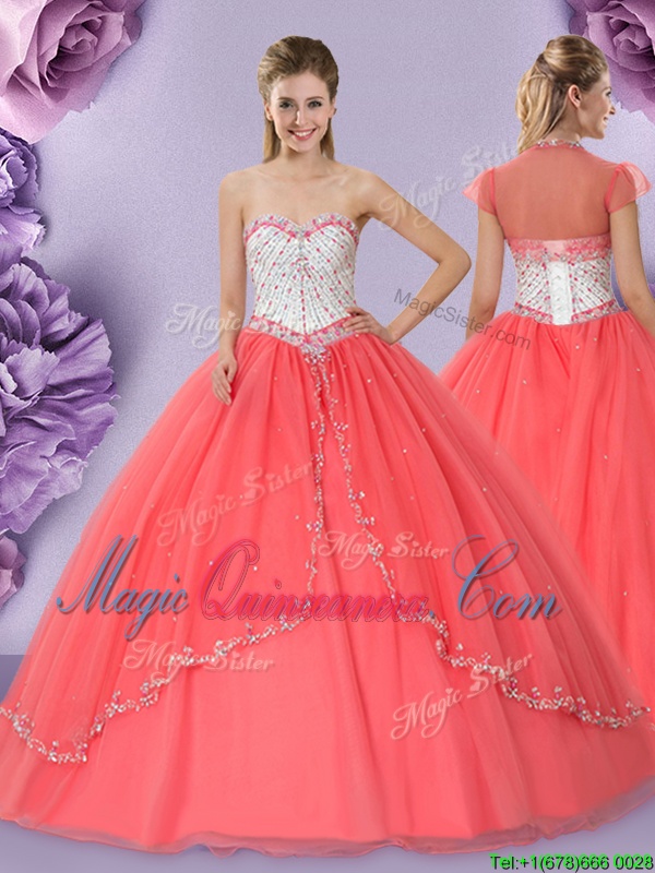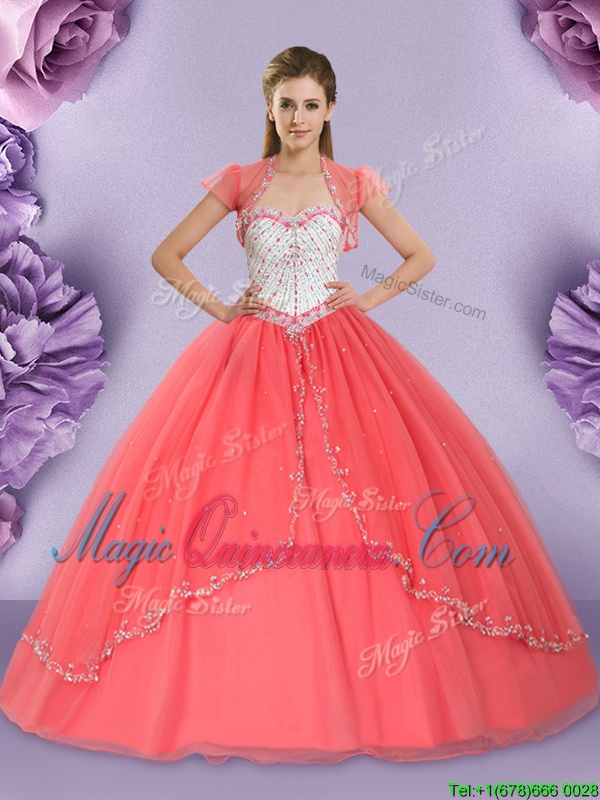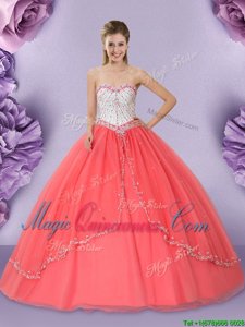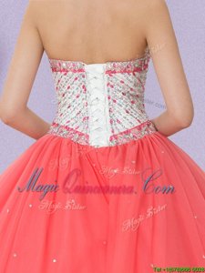 Elegant Watermelon Red Lace Up Sweetheart Beading Quinceanera Dress Tulle Sleeveless