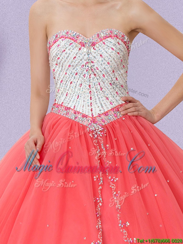 , Elegant Watermelon Red Lace Up Sweetheart Beading Quinceanera Dress Tulle Sleeveless