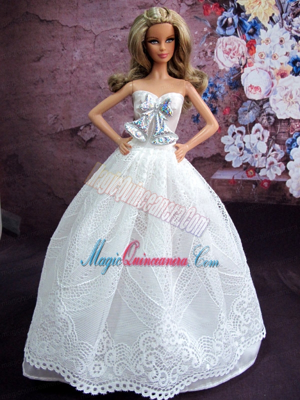 , Elegant White Gown With White Lace and Bowknot Made To Fit The Barbie Doll