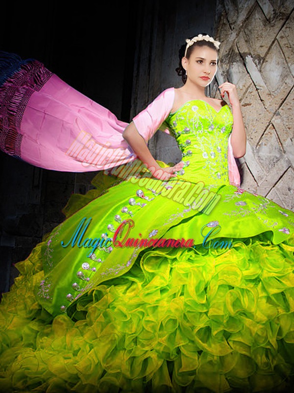 Elegant Yellow Green Ball Gowns Organza Sweetheart Sleeveless Embroidery and Ruffles Lace Up Sweet 16 Dresses Brush Train