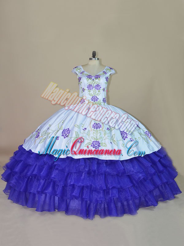 Embroidery and Ruffled Layers Quince Ball Gowns Blue and Purple Lace Up Sleeveless Floor Length