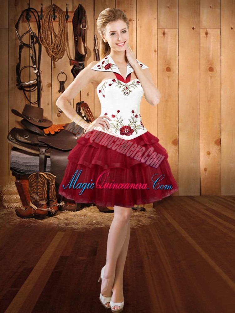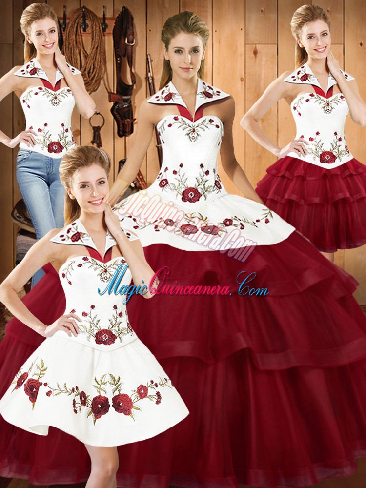 Embroidery and Ruffled Layers Sweet 16 Quinceanera Dress Wine Red Lace Up Sleeveless With Train Sweep Train