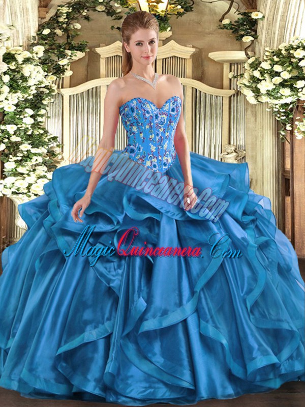 , Embroidery and Ruffles 15 Quinceanera Dress Blue Lace Up Sleeveless Floor Length