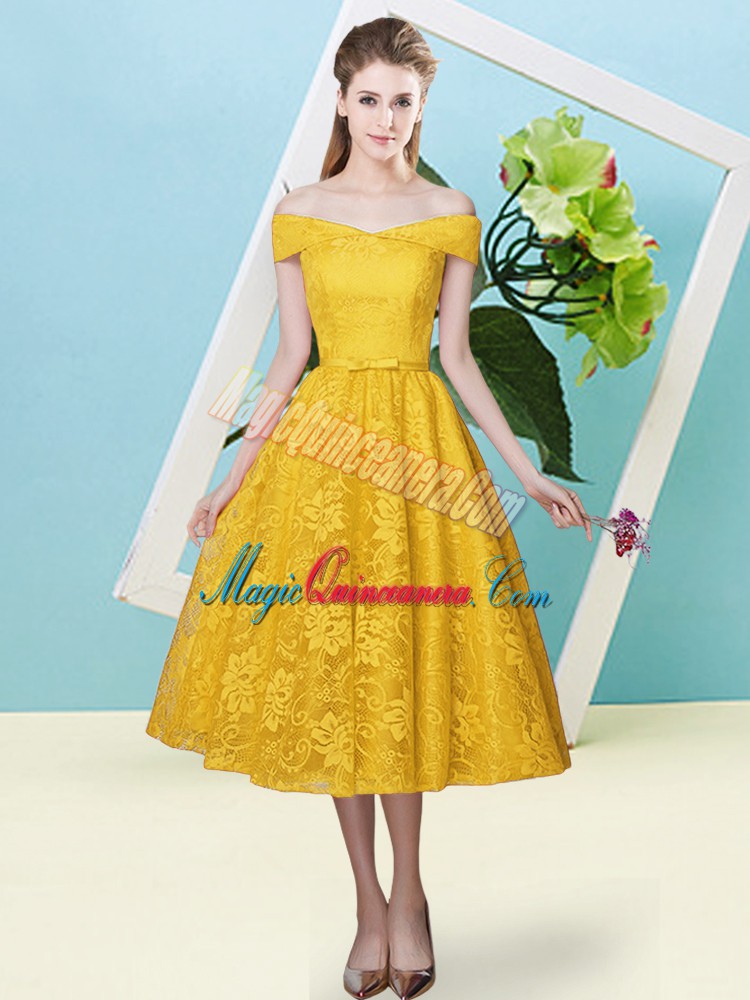 Empire Vestidos de Damas Gold Off The Shoulder Lace Cap Sleeves Tea Length Lace Up