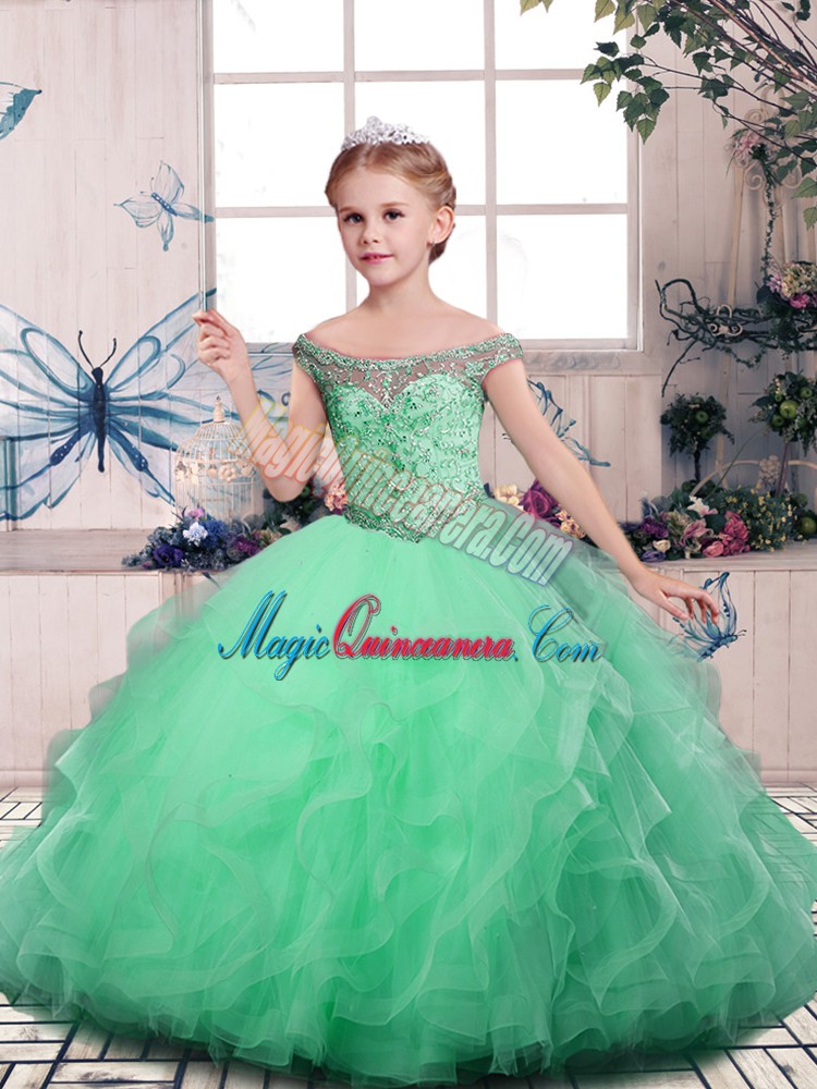 Enchanting Apple Green Off The Shoulder Lace Up Beading and Ruffles Child Pageant Dress Sleeveless