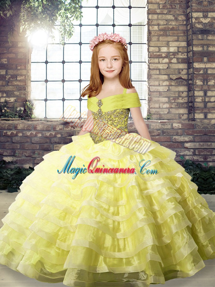 Excellent Ball Gowns Sleeveless Yellow Little Girls Pageant Dress Wholesale Brush Train Lace Up