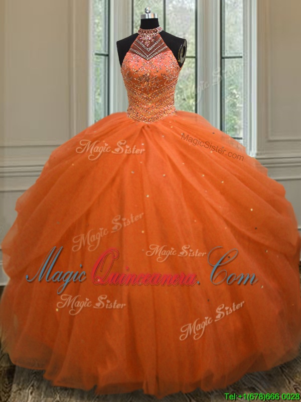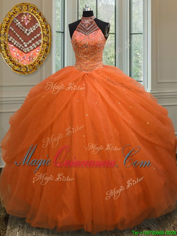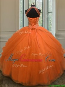 Excellent Halter Top Floor Length Ball Gowns Sleeveless Orange Red Quinceanera Dresses Lace Up