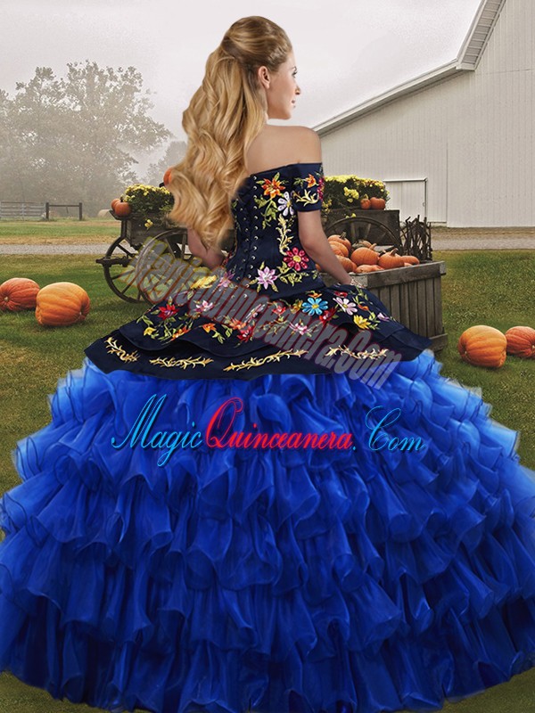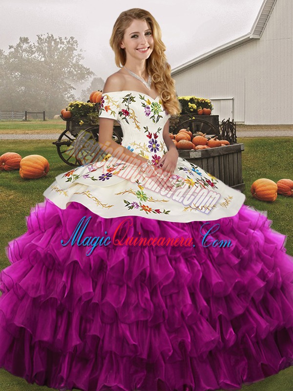 Excellent Off The Shoulder Sleeveless Organza Vestidos de Quinceanera Embroidery and Ruffled Layers Lace Up