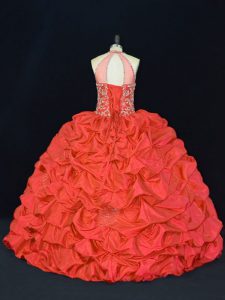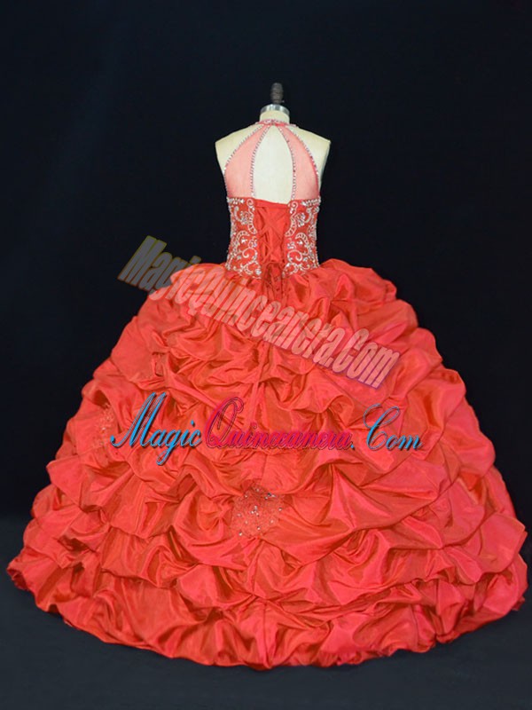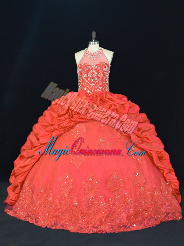 Excellent Red Halter Top Neckline Beading and Appliques and Embroidery Quinceanera Gowns Sleeveless Lace Up