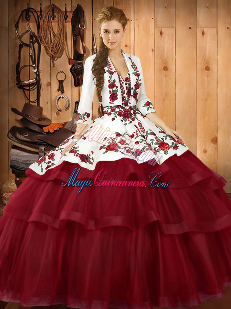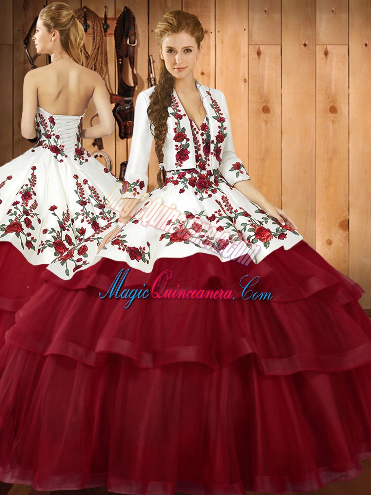 , Excellent Sleeveless Embroidery Lace Up Quinceanera Gown with Wine Red Sweep Train