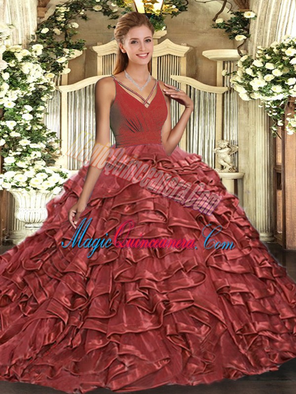 Excellent Sweep Train Ball Gowns Sweet 16 Dress Coral Red V-neck Organza Sleeveless With Train Backless - Magic Quinceanera