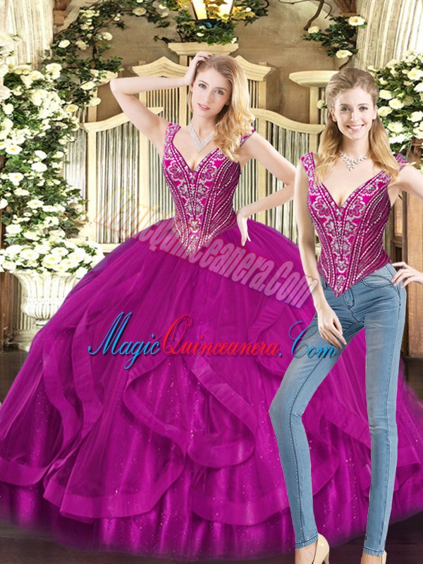 Exceptional Fuchsia Ball Gowns Organza V-neck Sleeveless Beading and Ruffles Floor Length Lace Up Sweet 16 Dress