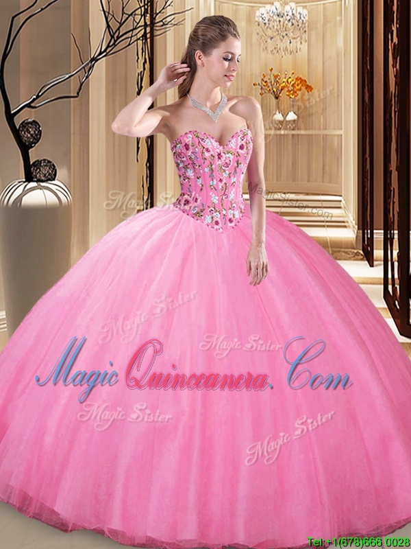 Exceptional Rose Pink Ball Gowns Tulle Sweetheart Sleeveless Embroidery Floor Length Lace Up Sweet 16 Dresses