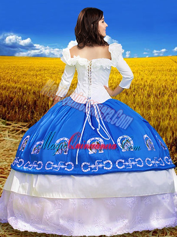 Exquisite Blue Lace Up Off The Shoulder Embroidery Vestidos de Quinceanera Taffeta 3 4 Length Sleeve