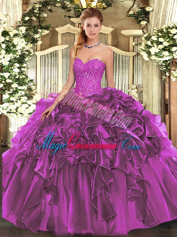 , Exquisite Purple Sleeveless Floor Length Beading and Ruffles Lace Up Sweet 16 Dress