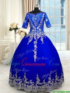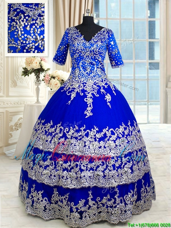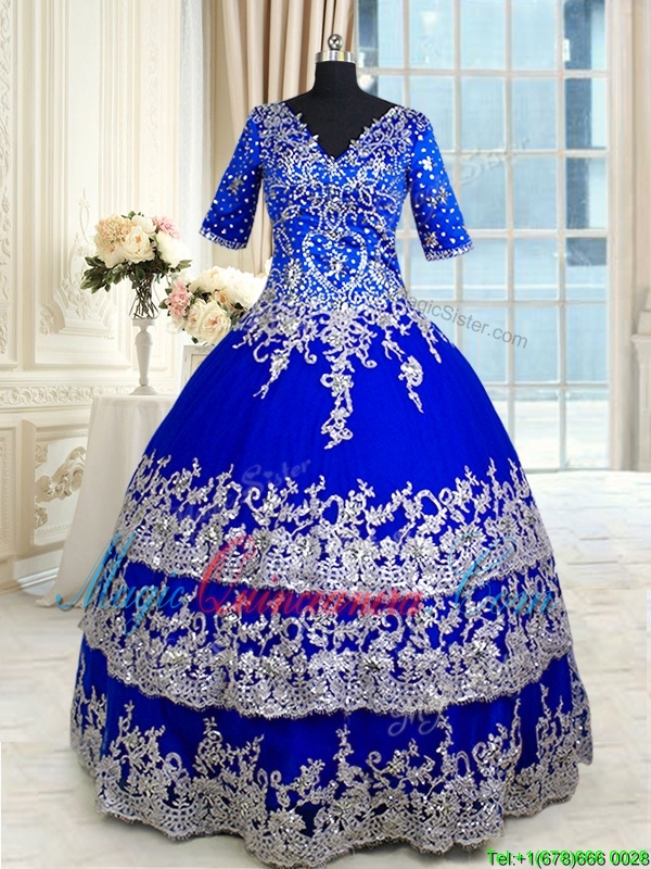 Exquisite Royal Blue Zipper Quinceanera Gown Appliques and Ruffled Layers Half Sleeves Floor Length