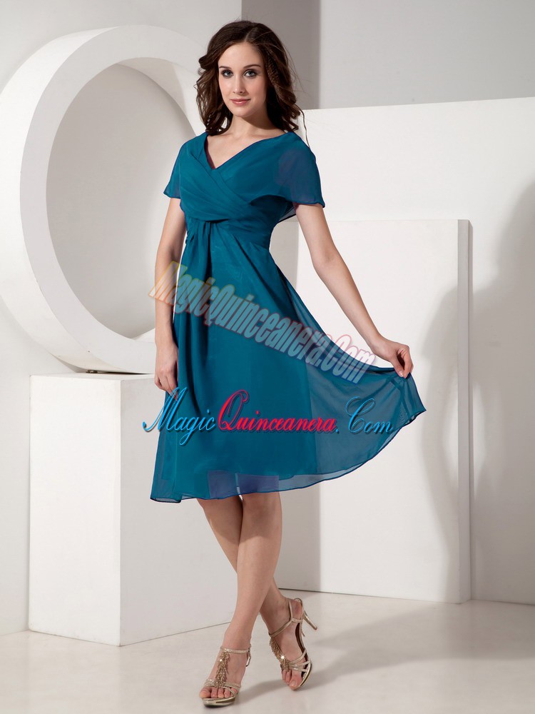 , Exquisite V-neck Short Sleeves Chiffon Mother Of The Bride Dress Ruching Zipper