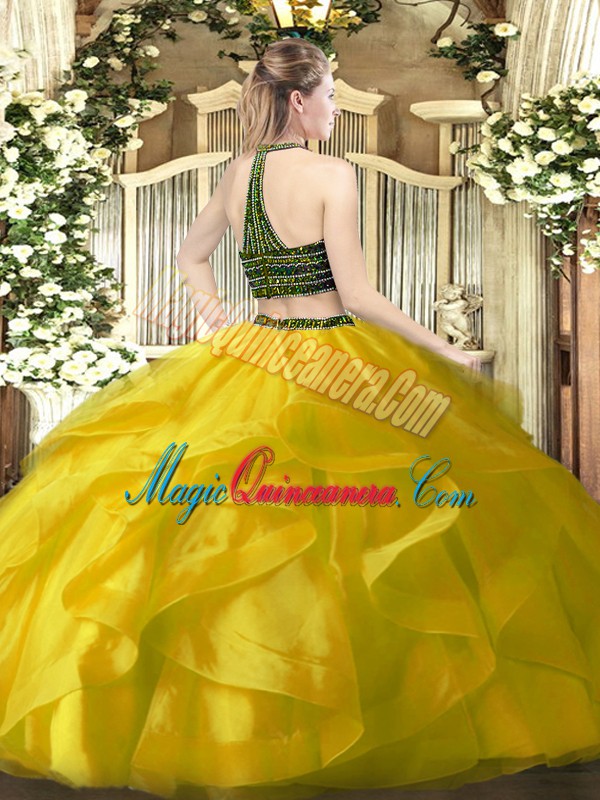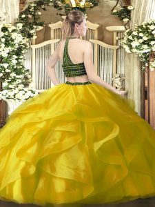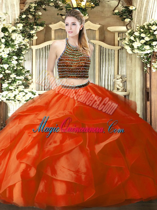 Extravagant Ball Gowns Ball Gown Prom Dress Orange Red Halter Top Organza Sleeveless Floor Length Zipper