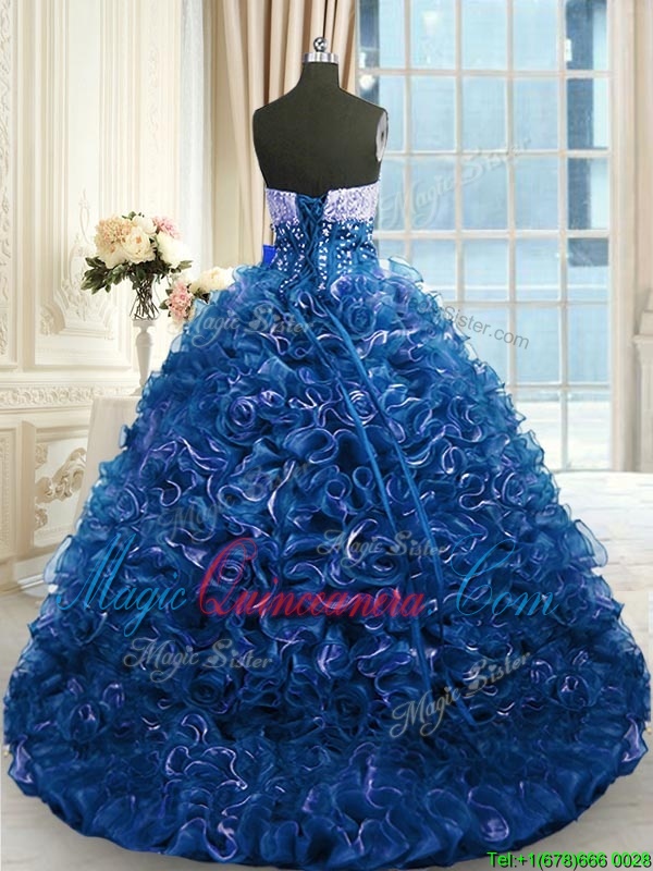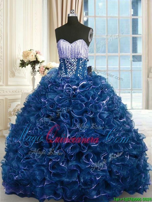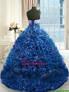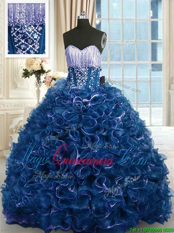Extravagant Navy Blue Ball Gowns Organza Sweetheart Sleeveless Beading and Ruffles With Train Lace Up 15 Quinceanera Dress Brush Train