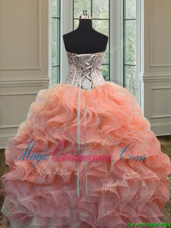 Extravagant Organza Sweetheart Sleeveless Lace Up Beading and Ruffles Ball Gown Prom Dress in Watermelon Red