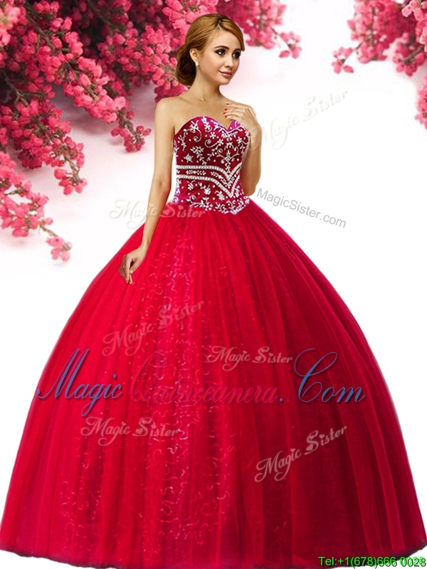 Extravagant Red Lace Up Sweetheart Beading Sweet 16 Quinceanera Dress Tulle Sleeveless