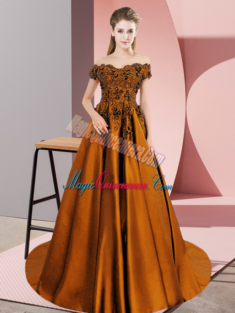 , Extravagant Sleeveless Satin Court Train Zipper Quinceanera Dress in Brown with Lace