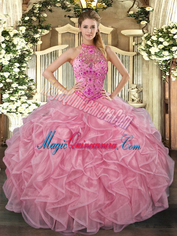 Eye-catching Baby Pink Ball Gowns Embroidery and Ruffles 15th Birthday Dress Lace Up Organza Sleeveless Floor Length