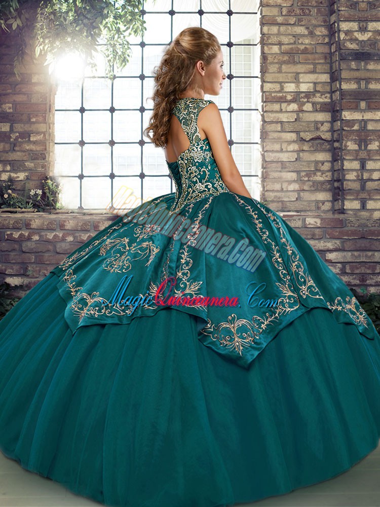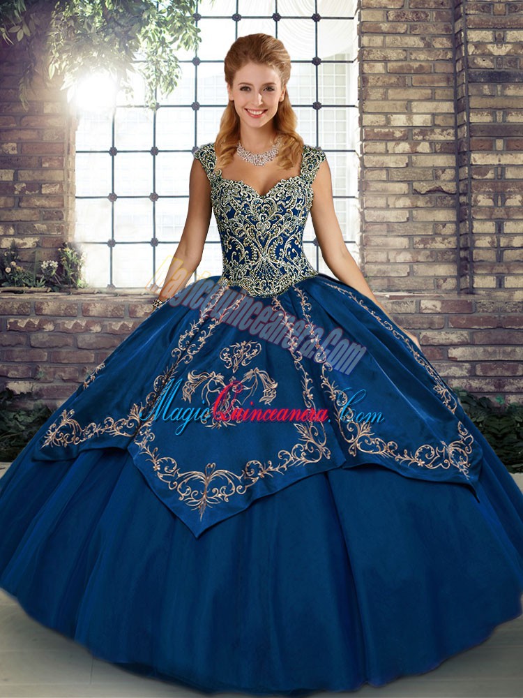 Eye-catching Blue Straps Neckline Beading and Embroidery Quinceanera Dress Sleeveless Lace Up