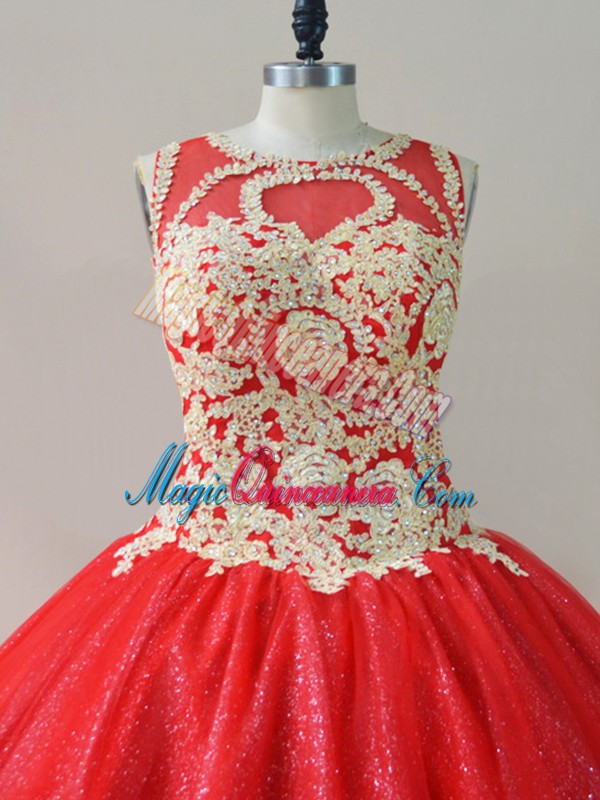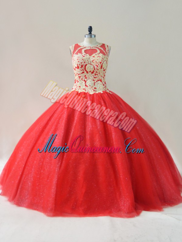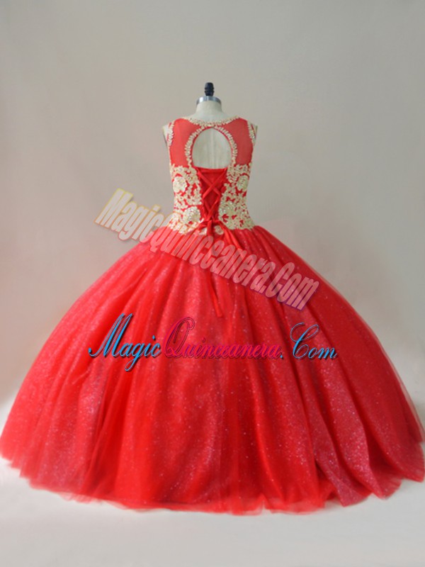 Eye-catching Floor Length Red Sweet 16 Dress Scoop Sleeveless Lace Up