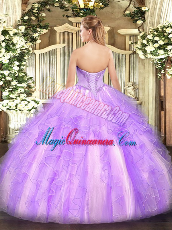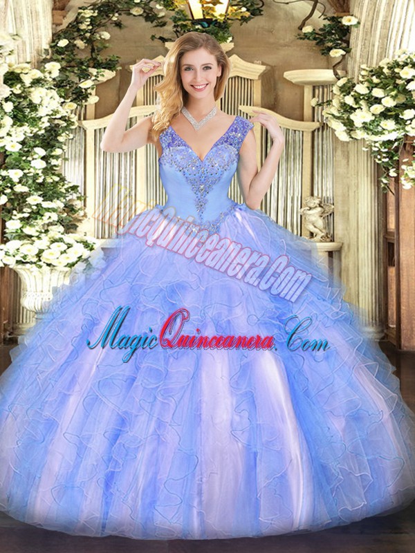 Eye-catching Light Blue Ball Gowns Organza V-neck Sleeveless Beading and Ruffles Floor Length Lace Up Quinceanera Gowns