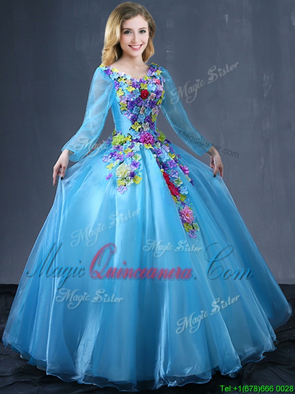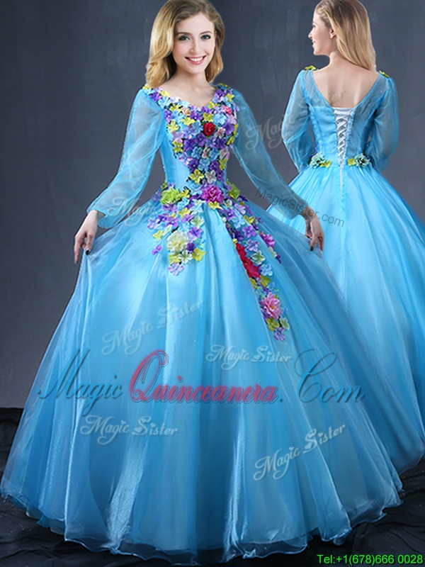 , Eye-catching Long Sleeves Lace Up Floor Length Appliques 15th Birthday Dress