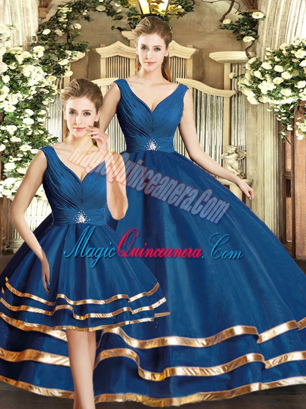 Eye-catching Navy Blue Tulle Backless Sweet 16 Quinceanera Dress Sleeveless Floor Length Beading and Ruffled Layers