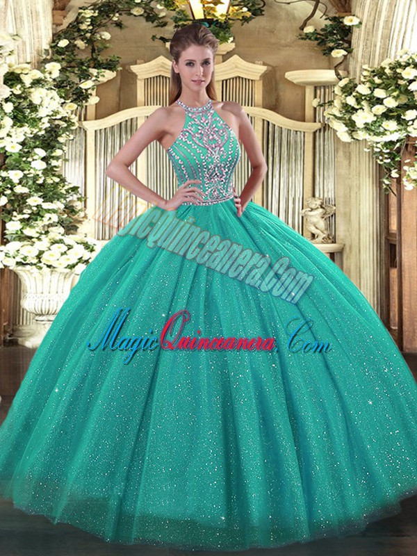 Eye-catching Turquoise Sleeveless Tulle Lace Up Vestidos de Quinceanera for Military Ball and Sweet 16 and Quinceanera