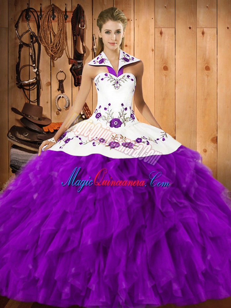 Fabulous Eggplant Purple Ball Gowns Embroidery and Ruffles Quince Ball Gowns Lace Up Satin and Organza Sleeveless Floor Length