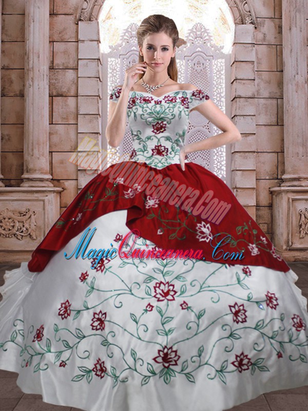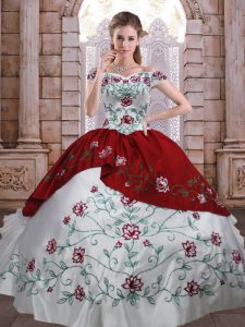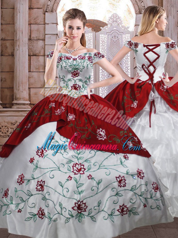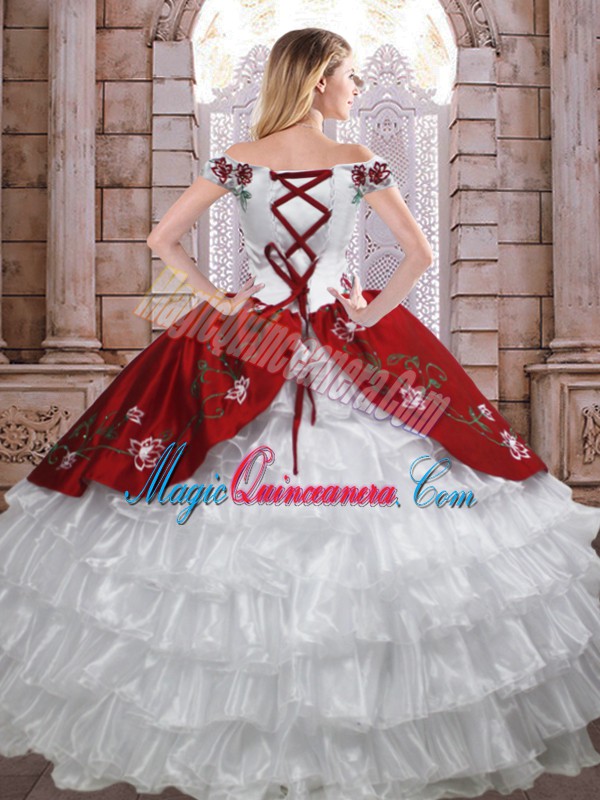 Fabulous Floor Length White And Red Quinceanera Gown Off The Shoulder Sleeveless Lace Up