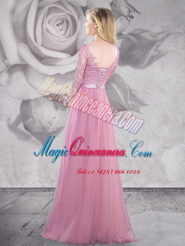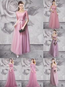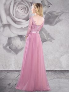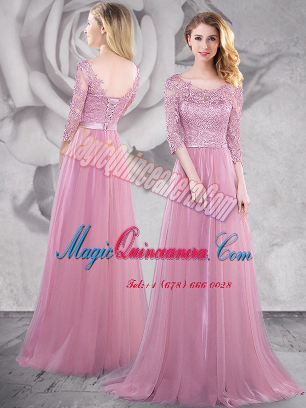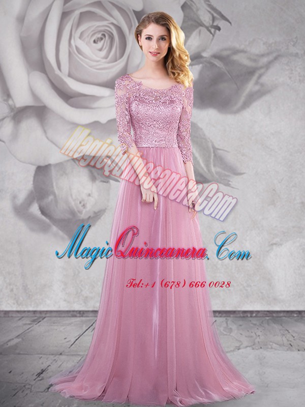 Fabulous Scoop Half Sleeves Mother Of The Bride Dress With Brush Train Lace and Ruching Pink Tulle