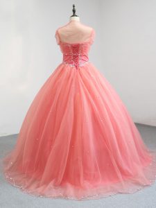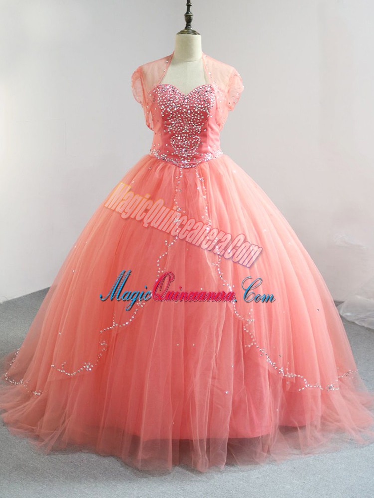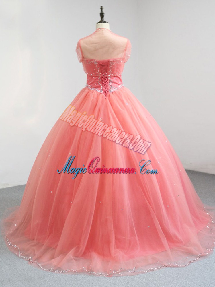 Fabulous Watermelon Red Ball Gowns Tulle V-neck Sleeveless Beading Floor Length Lace Up Quinceanera Dress
