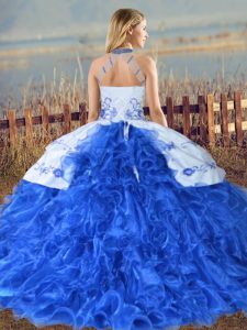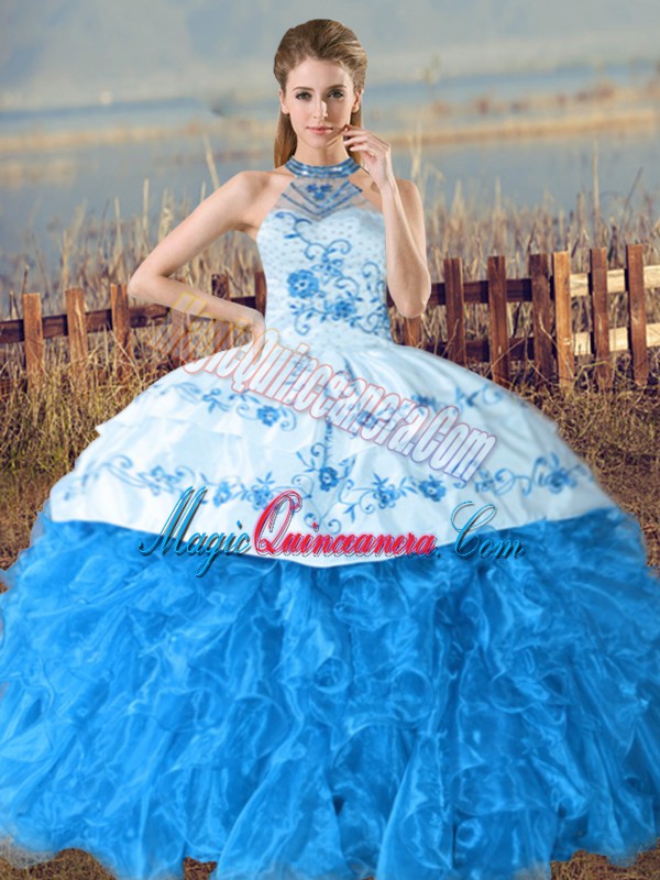 Fancy Baby Blue Ball Gowns Organza Halter Top Sleeveless Embroidery and Ruffles Lace Up Quince Ball Gowns Court Train