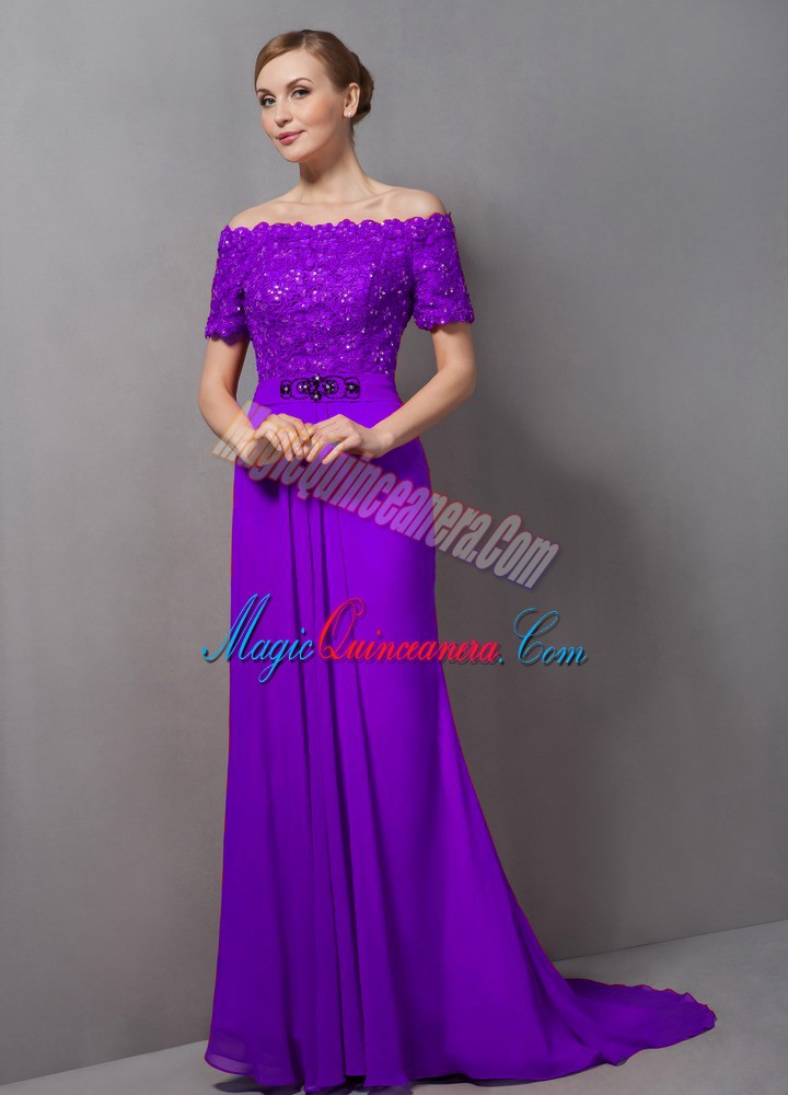 Fancy Eggplant Purple Chiffon Zipper Off The Shoulder Short Sleeves Mother Dresses Sweep Train Lace