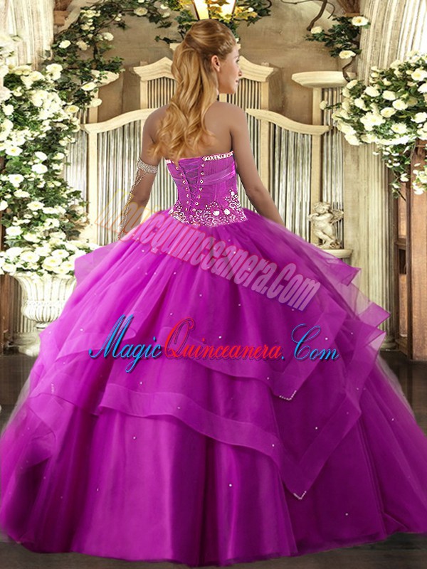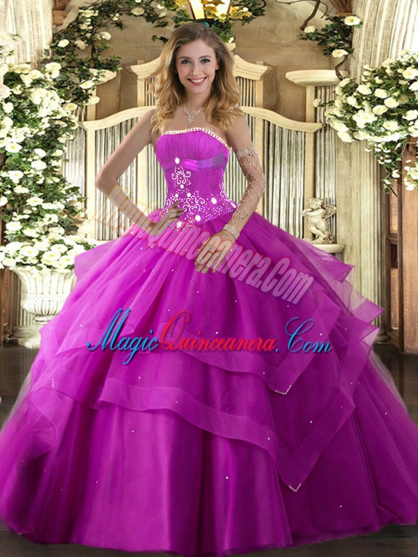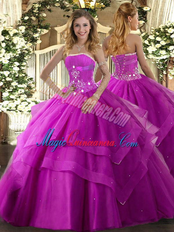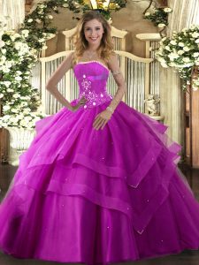 , Fancy Fuchsia Sleeveless Beading and Ruffled Layers Floor Length Sweet 16 Dress