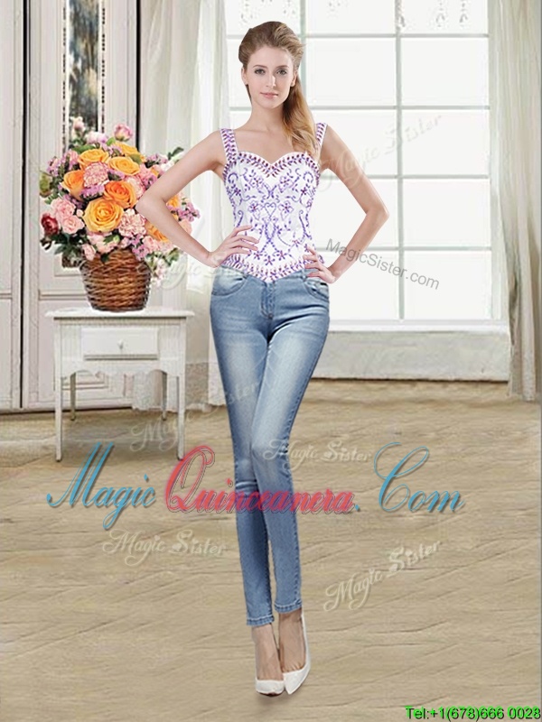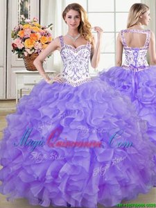 Fancy Organza Straps Sleeveless Lace Up Beading and Lace and Ruffles Ball Gown Prom Dress in Lavender