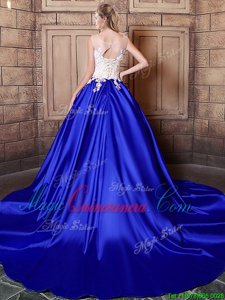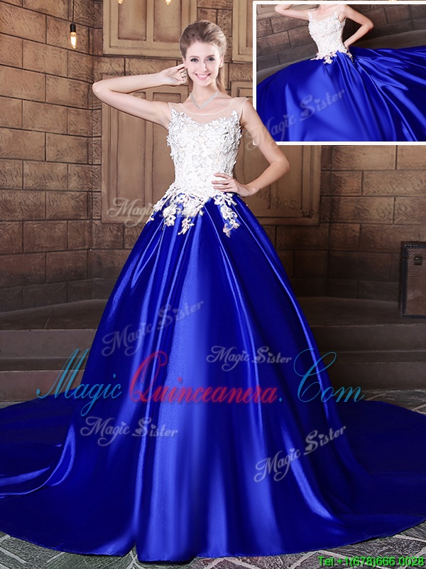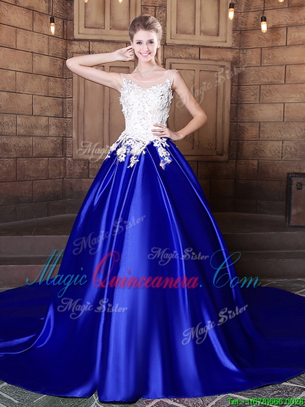 Fancy Scoop Sleeveless Elastic Woven Satin Quinceanera Dresses Appliques Court Train Lace Up