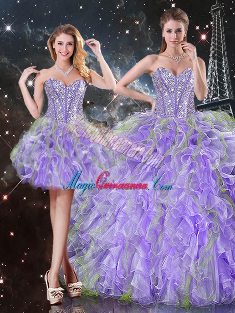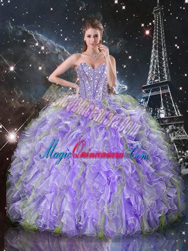 Fancy Sleeveless Organza Floor Length Lace Up Sweet 16 Quinceanera Dress in Lavender with Beading and Ruffles