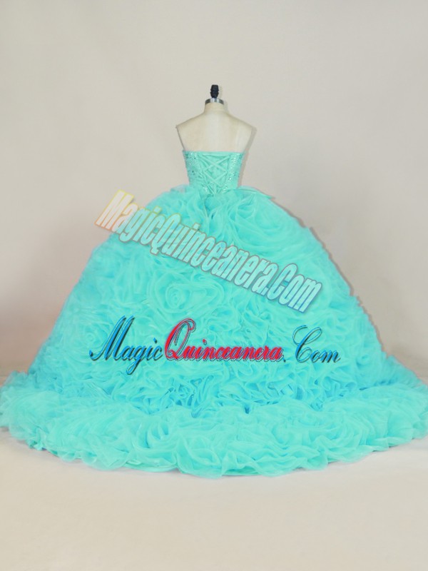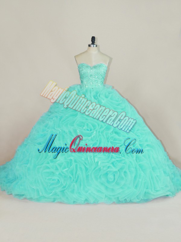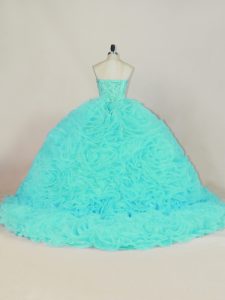 Fantastic Aqua Blue Fabric With Rolling Flowers Lace Up Sweetheart Sleeveless 15th Birthday Dress Court Train Beading and Ruffles