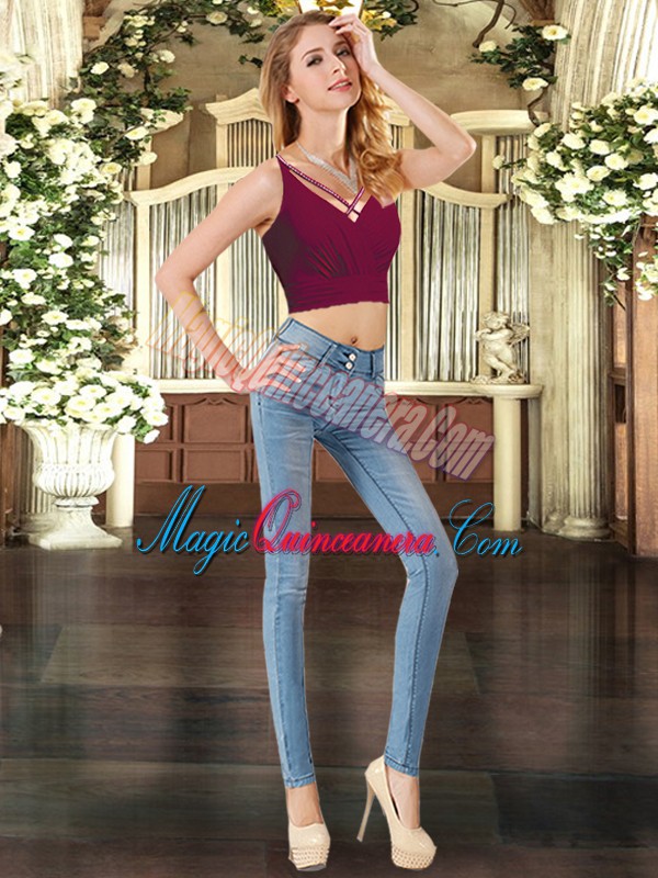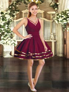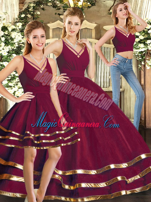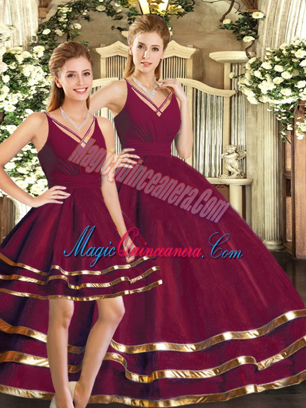 Fantastic Burgundy Tulle Backless V-neck Sleeveless Floor Length Quinceanera Dress Ruffled Layers