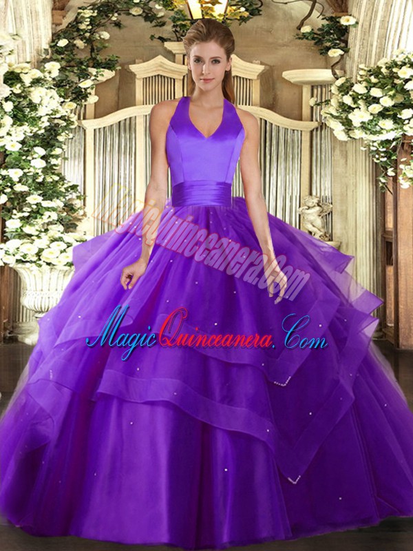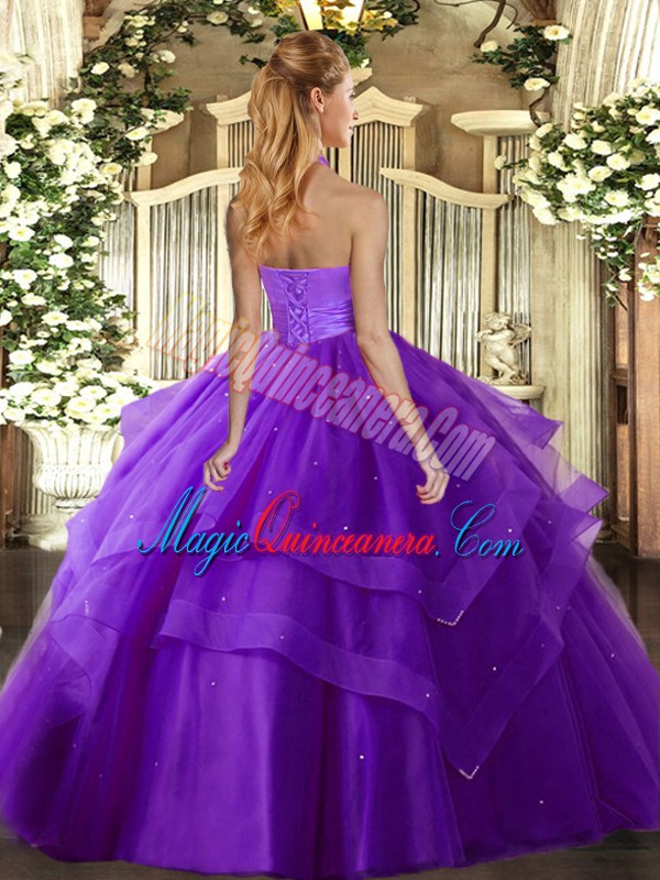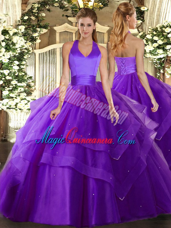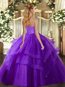 Fantastic Floor Length Lace Up Vestidos de Quinceanera Purple for Military Ball and Sweet 16 and Quinceanera with Ruffled Layers
